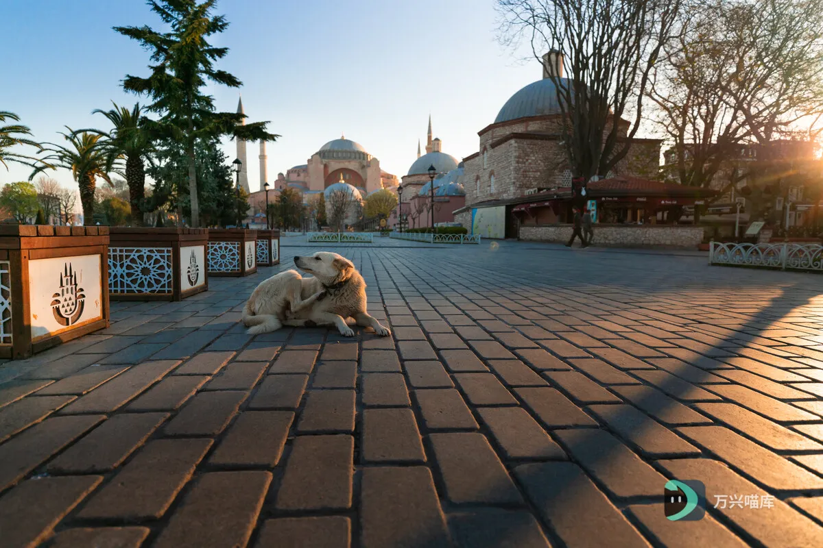 一只流浪狗一大早就在伊斯坦布尔的一座清真寺前醒来