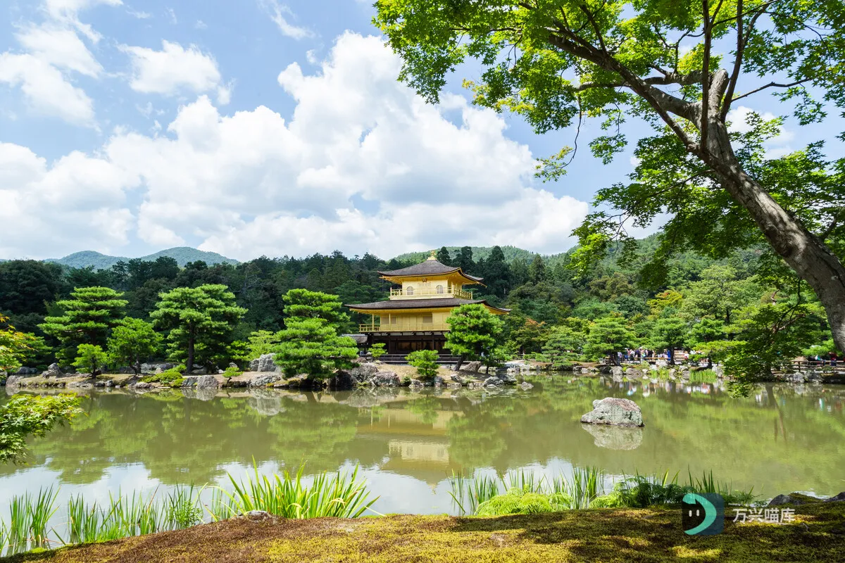在阳光明媚的早晨,金色的金阁寺倒映在水中