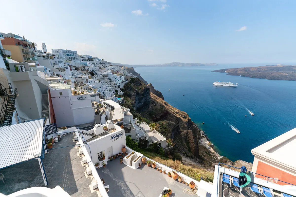 小船和渡轮在希腊圣托里尼的海岸上行驶