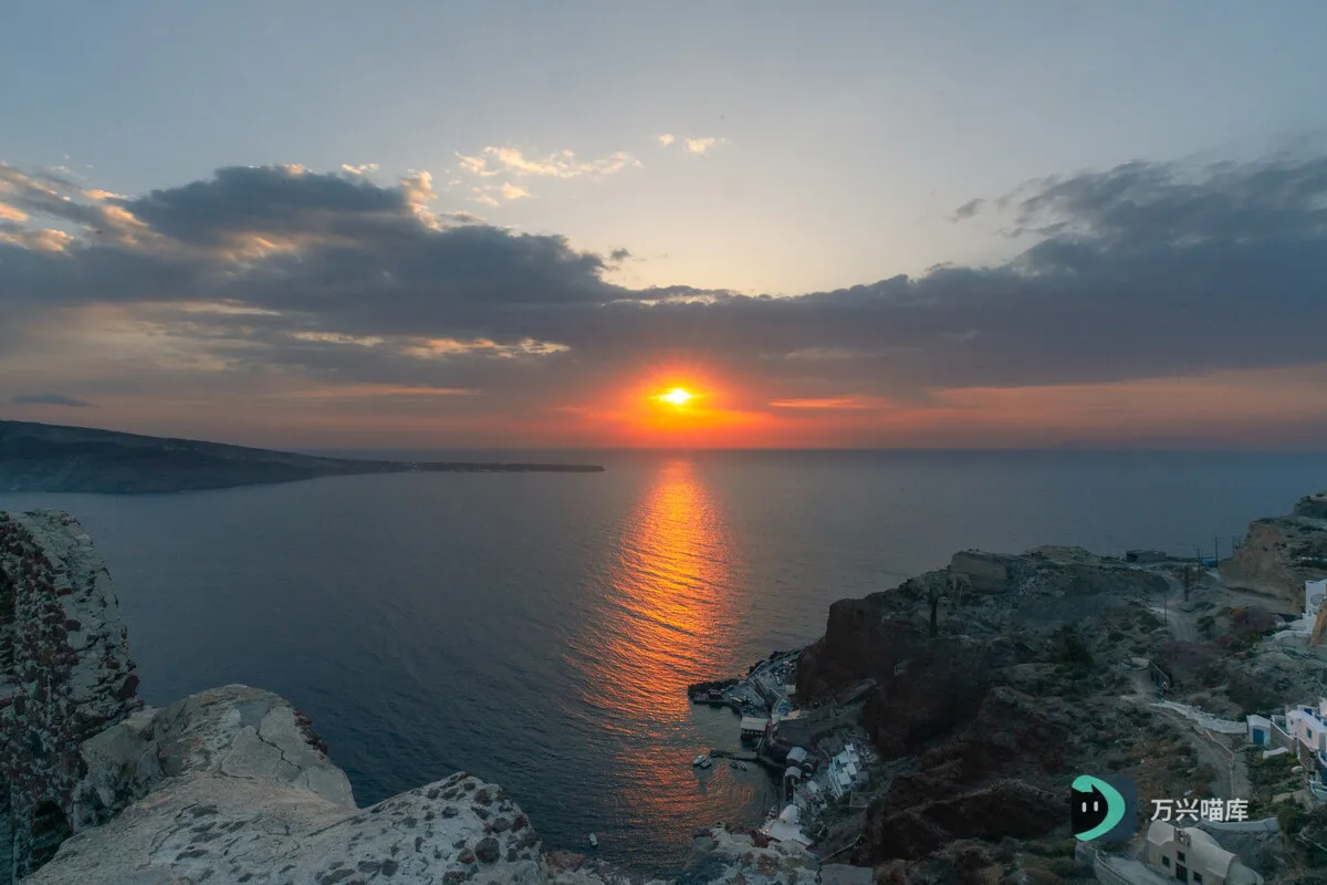 太阳在圣托里尼落山时在水面上形成一条长长的条纹