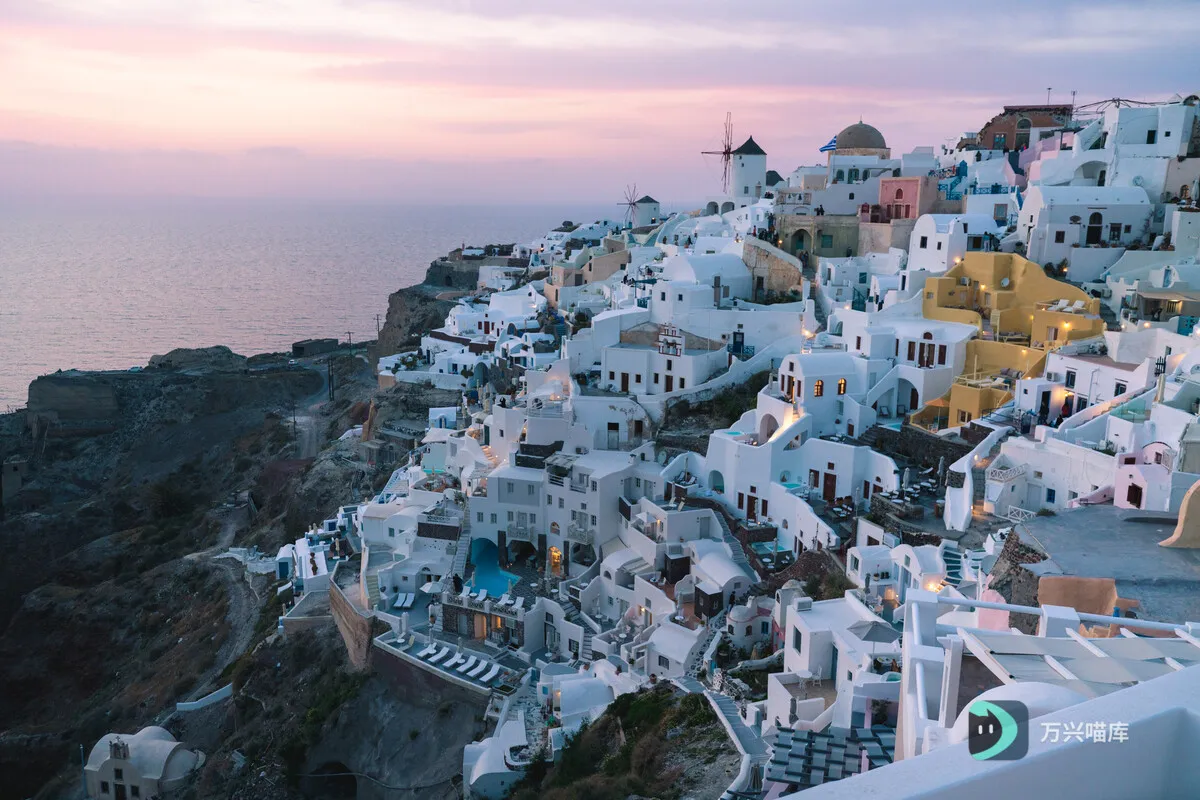 太阳正在圣托里尼岛的伊亚镇后面落山